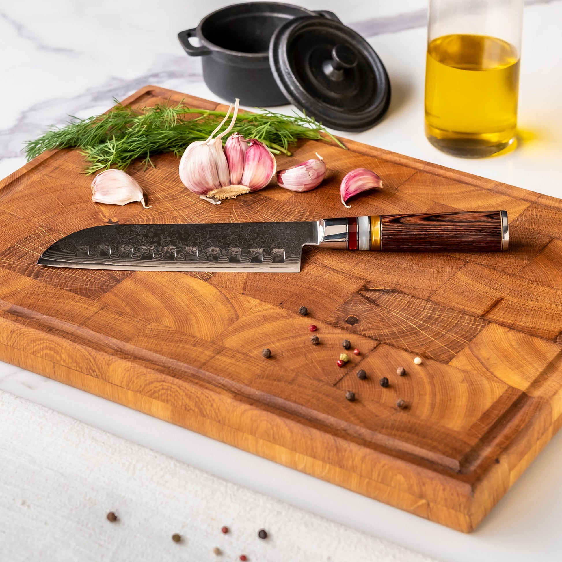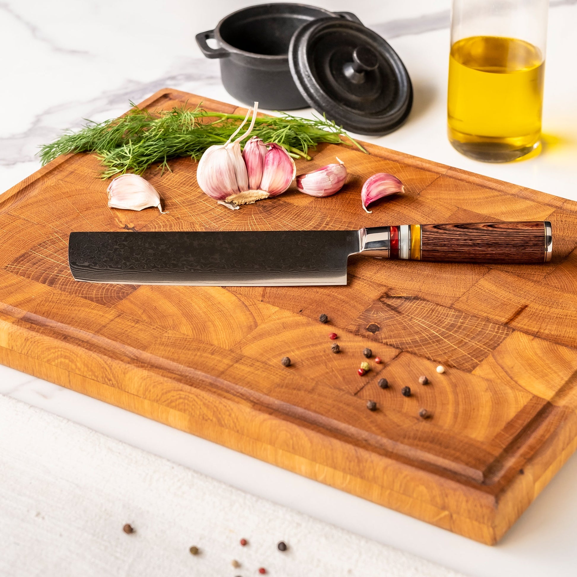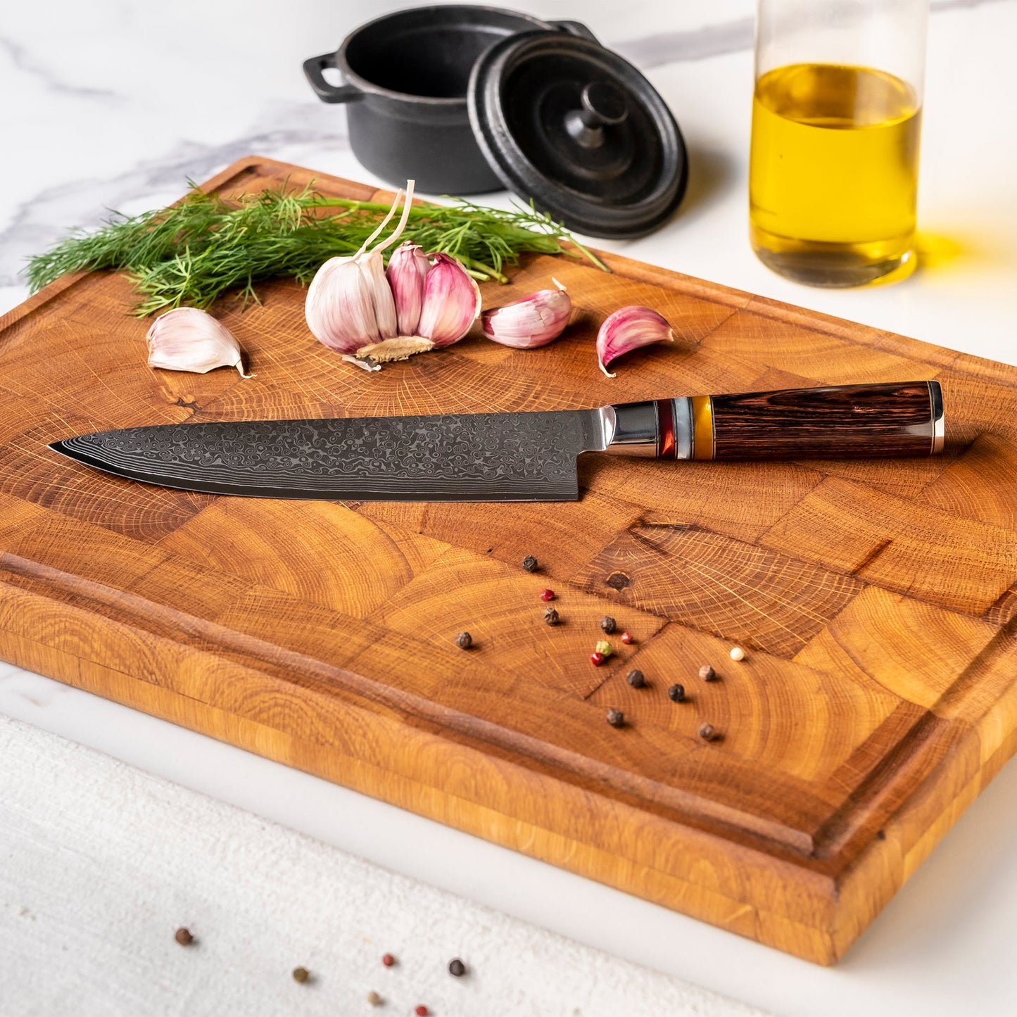 Ce bloc à couteaux en bois d'acacia est livré avec 7 couteaux de la marque Micarta Jewels séries adaptées à diverses tâches de découpe en cuisine. La combinaison de manches en bois de pakka avec des anneaux en micarta ornés de bijoux et d'un bloc à couteaux en bois d'acacia fera vraiment ressortir les couteaux.