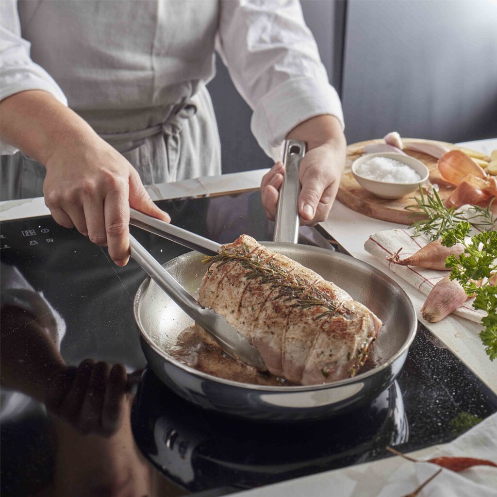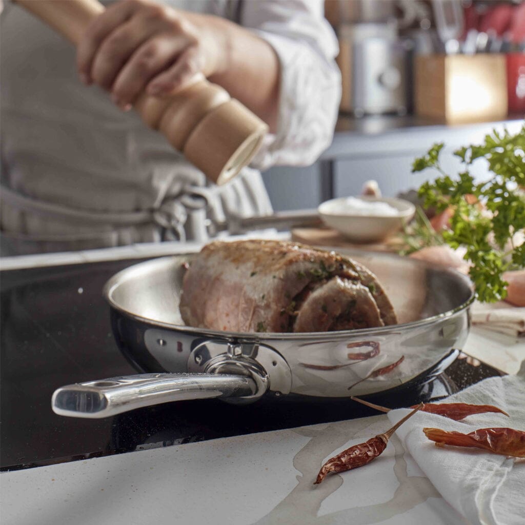 This pan has a 5-layer base. 5-layer pans elevate cooking with five layers of aluminum and stainless steel. These extra layers ensure even better heat distribution and retention, giving you more control over the temperature. Ideal for delicate cooking techniques where precision makes all the difference. The pan's weight gives you that extra bit of stability while cooking.