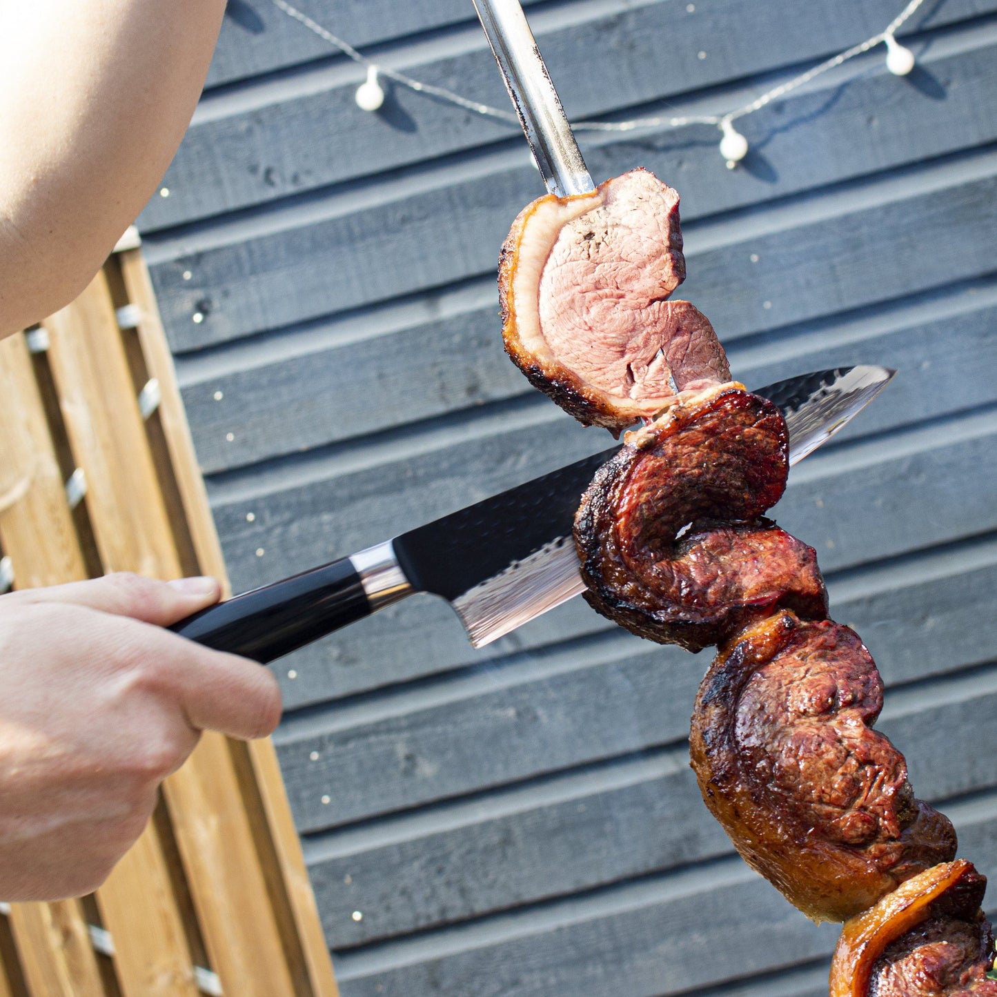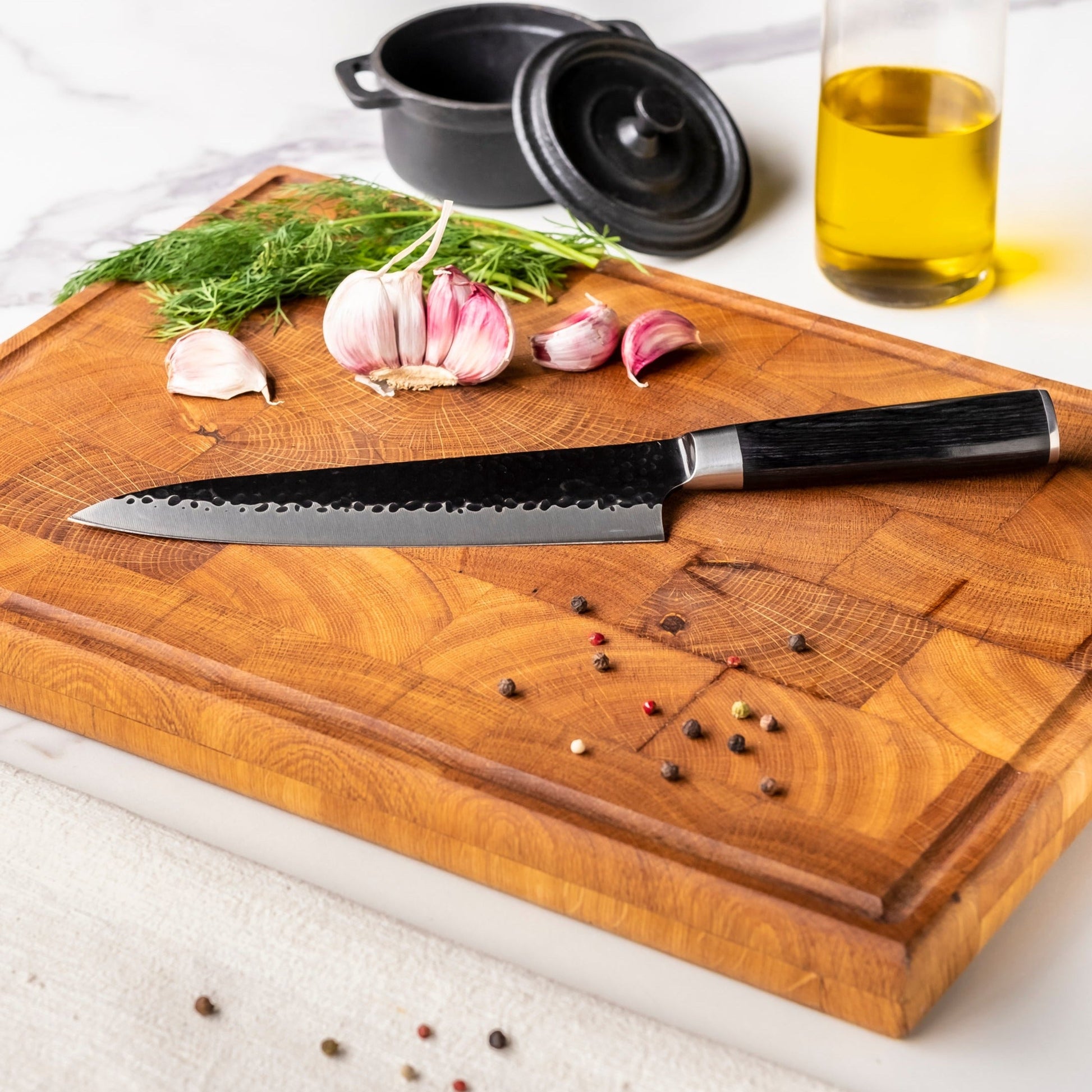The chef's knife Hammered Stainless Steel Black from Shinrai Knives unique for every kitchen. This elegant chef's knife can be used for all cutting tasks. With this chef's knife you can easily cut meat, fish, vegetables, fruit and herbs.