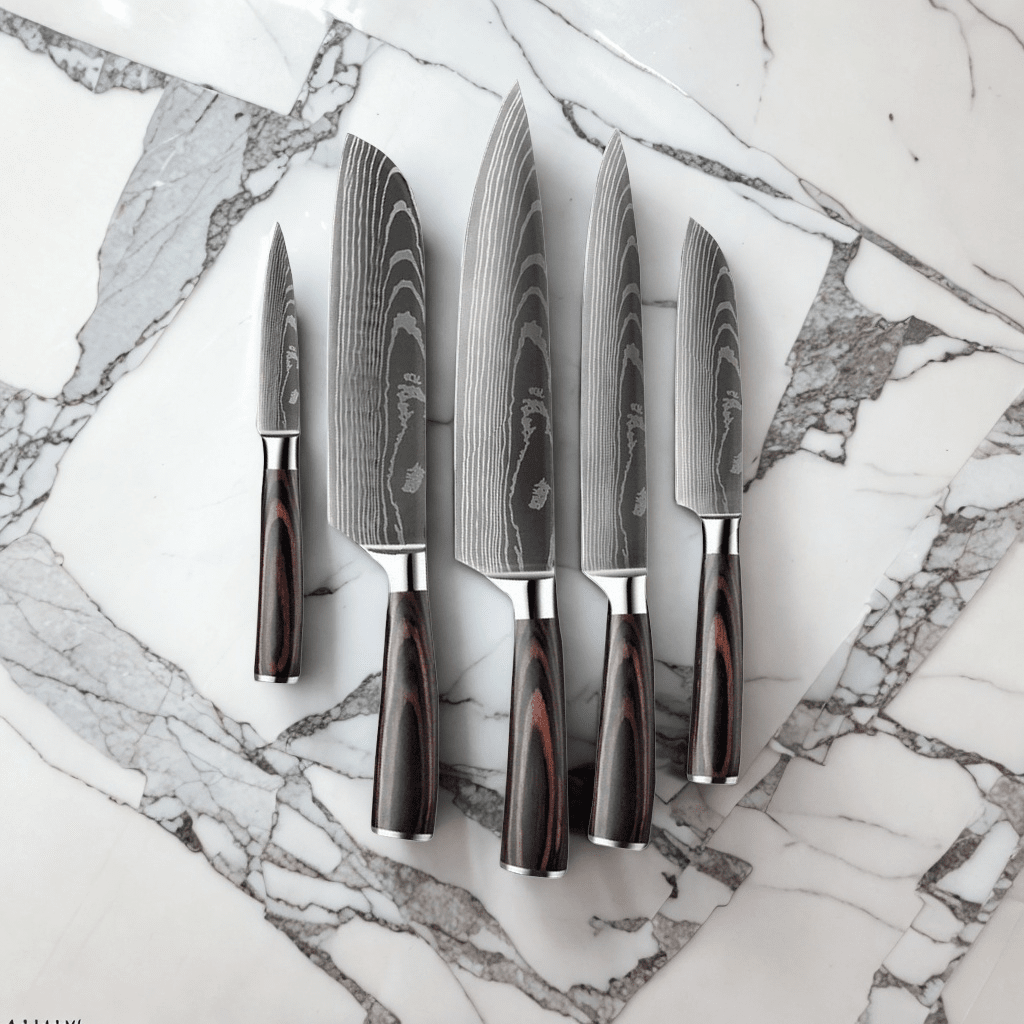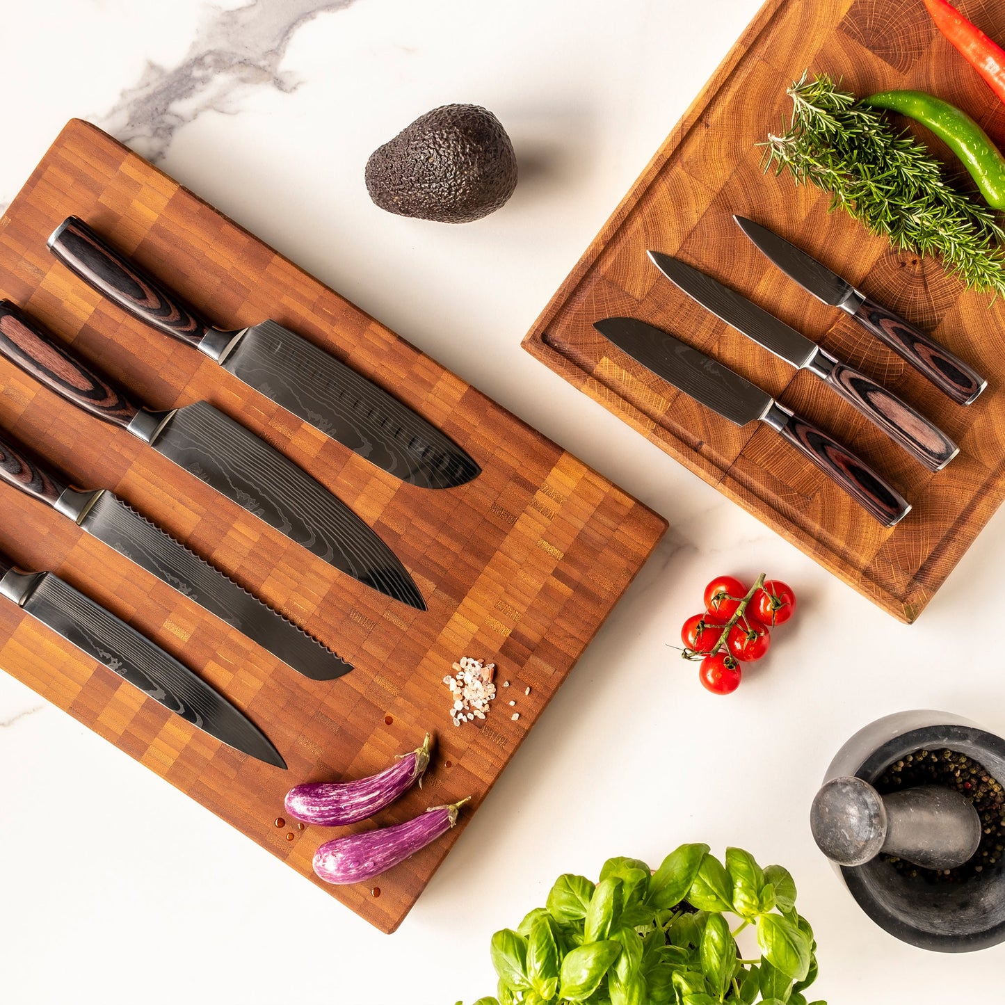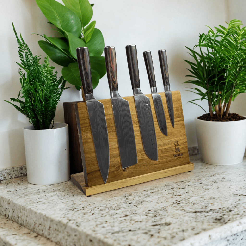 Shinrai 's Damask Print Series offers a perfect balance between form and function. Each knife is crafted from high-carbon steel , features a decorative damask pattern, and is finished with pakkawood handles. Combined with the magnetic acacia wood knife block, this compact and practical set completes your kitchen.