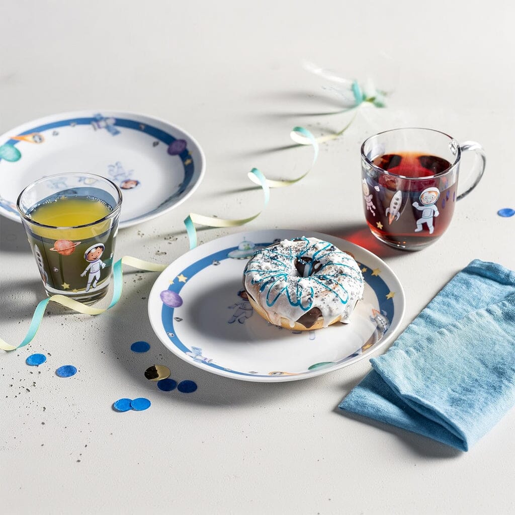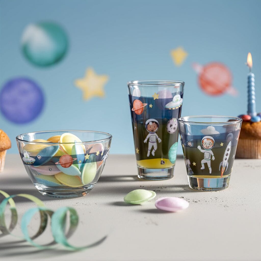 Enjoy your free time with the elegant Drinking Glass Bambini Space 215ml from Leonardo. This glass perfectly combines style and functionality and is the ideal gift for children. This glass from the bambini series is characterized by the space design printed on the glass.